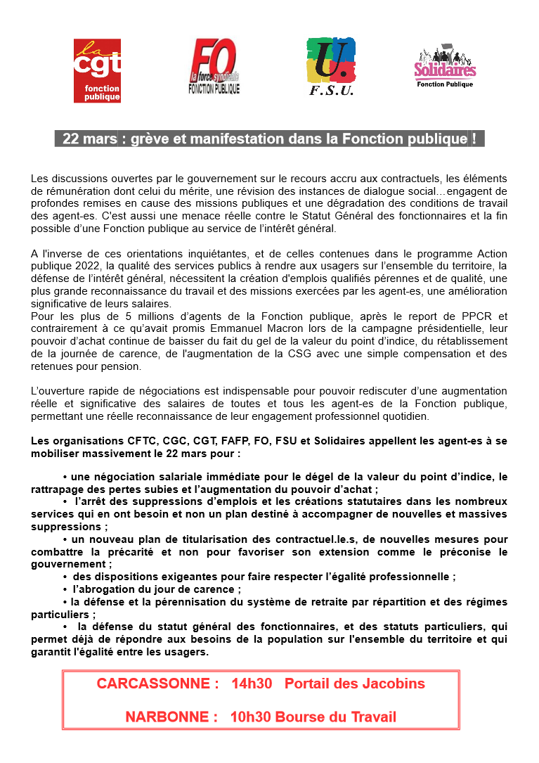 Tous ensemble le 22 mars. EN PJ l’appel intersyndical !